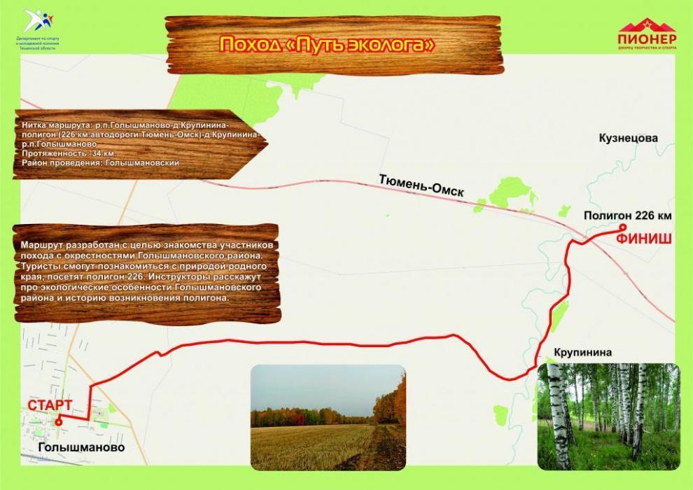 Маршрут разработан с целью знакомства участников похода с окрестностями Голышмановского района. Туристы смогут познакомиться с природой родного края, посетят полигон 226 км. Инструкторы расскажут про экологические особенности Голышмановского района и историю возникновения полигона.