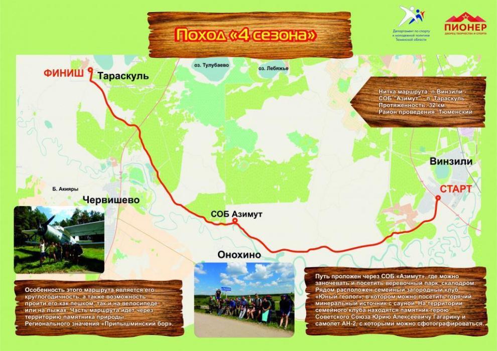Особенность этого маршрута является его круглогодичность, а также возможность пройти его как пешком, так и на велосипеде или на лыжах. Часть маршрута идет через территорию памятника природы Регионального значения «Припышминский бор». Путь проложен через СОБ «Азимут», где можно заночевать и посетить веревочный парк, скалодром. Рядом расположен семейный загородный клуб «Юный геолог», в котором можно посетить горячий минеральный источник с сауной. На территории семейного клуба находятся памятник герою Советского Союза Юрию Алексеевичу Гагарину и самолет АН-2, с которыми можно сфотографироваться.