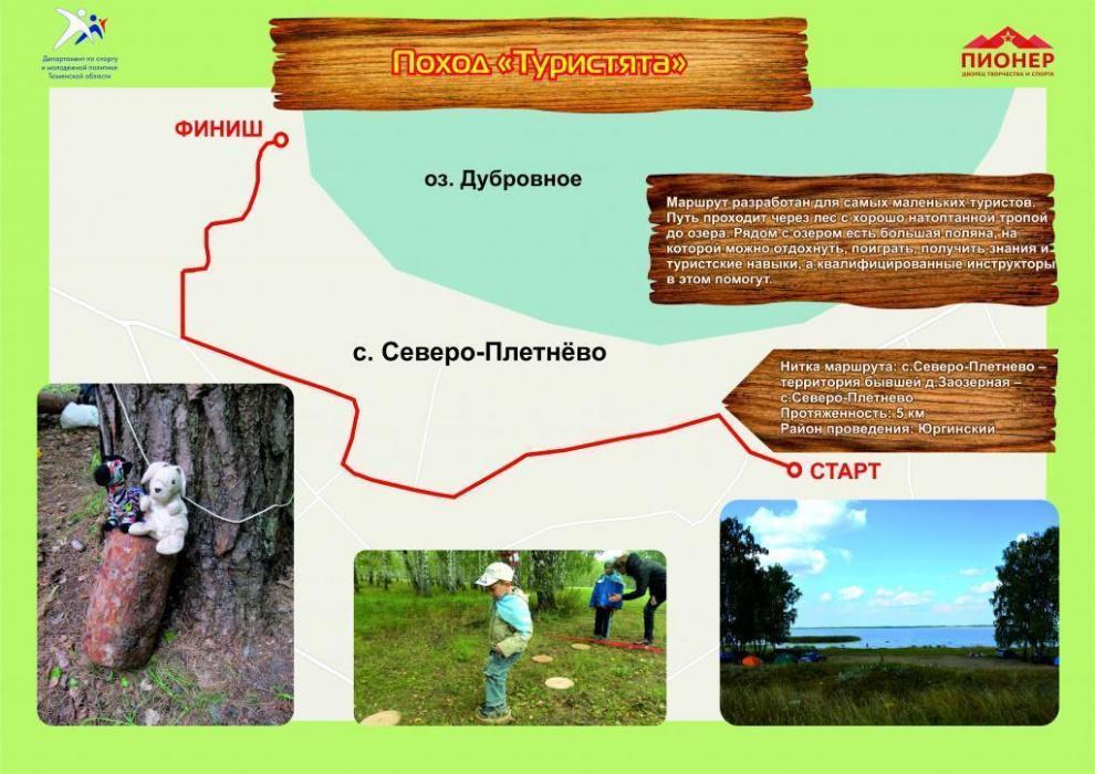 Маршрут разработан для самых маленьких туристов. Путь проходит через лес с хорошо натоптанной тропой. Рядом с озером есть большая поляна, на которой можно отдохнуть, поиграть, получить знания и туристские навыки, а квалифицированные инструкторы в этом помогут. А так же знакомство с окрестностями села Северо-Плетнево.