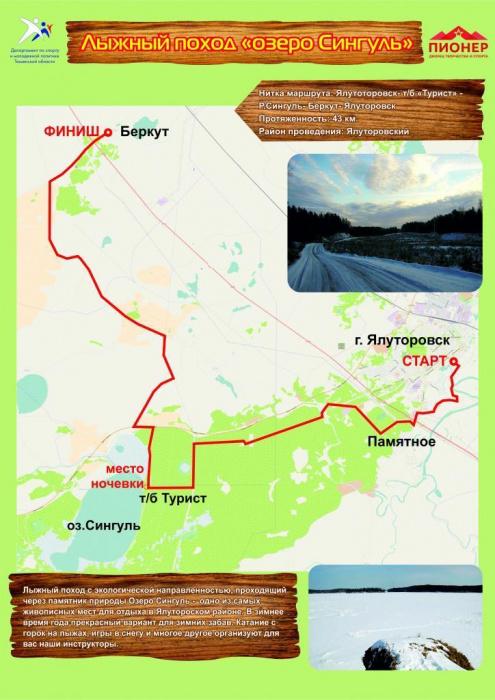 Лыжный поход с экологической направленностью, проходящий через памятник природы Озеро Сингуль - одно из самых живописных мест для отдыха в Ялутороском районе. В зимнее время года прекрасный вариант для зимних забав. Катание с горок на лыжах, игры в снегу и многое другое организуют для вас наши инструкторы.