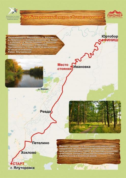 Маршрут проходит по Ялуторовскому району, через прекрасные лесные массивы, бескрайние поля и величественную реку Тобол. Инструкторы ознакомят участников похода с ландшафтом северного края, растительным и животным миром.